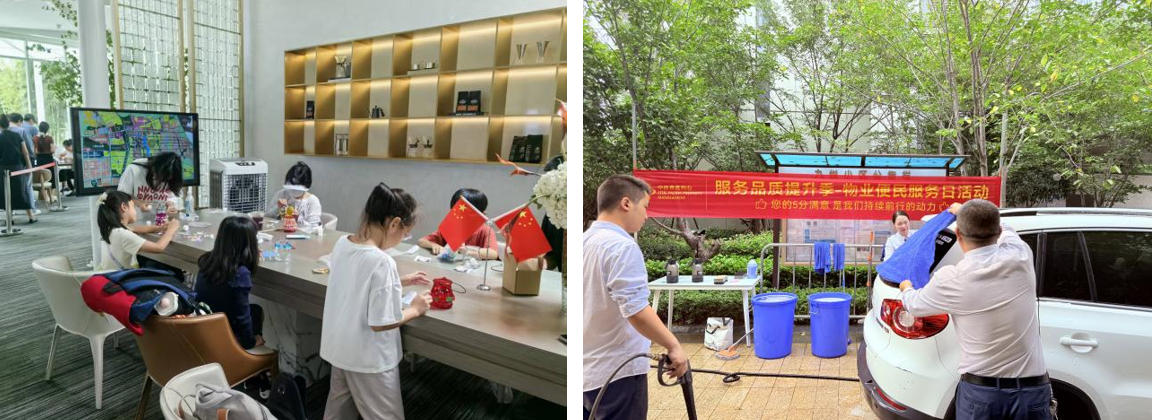 扬州各园区红灯笼高挂,放映红色电影、DIY国风扇、清洗地垫等活动轮番上演,把“家的温馨”与“国的喜悦”送到业主身边。